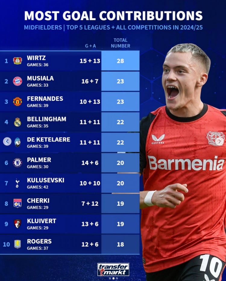 3月1日訊 德轉(zhuǎn)盤點了本賽季五大聯(lián)賽中場球員在各項賽事中參與進球榜,其中維爾茨居首,穆西亞拉次席,以下為具體榜單: