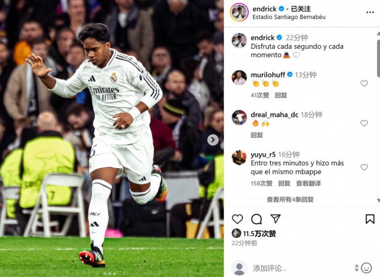 本場(chǎng)比賽恩德里克在最后時(shí)刻替補(bǔ)登場(chǎng),迎來個(gè)人歐冠淘汰賽首秀。賽后他也在個(gè)人社媒曬出本場(chǎng)照片,配文寫道:“享受比賽的每一個(gè)瞬間!”