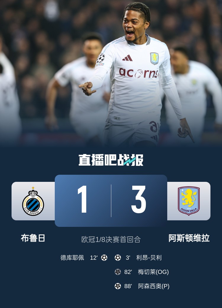 歐冠1/8決賽首回合,維拉3-1布魯日占先機(jī)。上半場(chǎng),明斯助攻貝利閃擊得手,德克伊珀推射扳平;下半場(chǎng),阿森西奧替補(bǔ)造險(xiǎn),措利斯失單刀,羅杰斯造梅切勒烏龍,卡什造點(diǎn)阿森西奧點(diǎn)射擴(kuò)大比分。