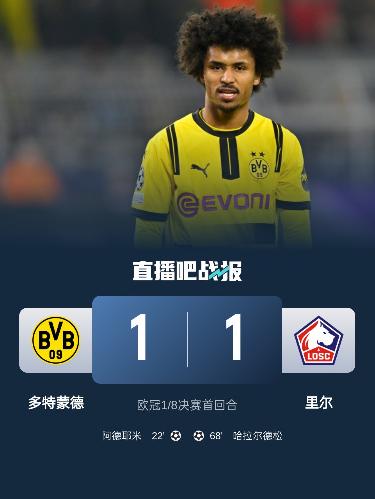 歐冠1/8決賽首回合,多特1-1里爾。上半場(chǎng),阿德耶米造險(xiǎn)+貼地?cái)仄崎T,格羅斯進(jìn)球被吹;下半場(chǎng),哈拉爾德松扳平比分。