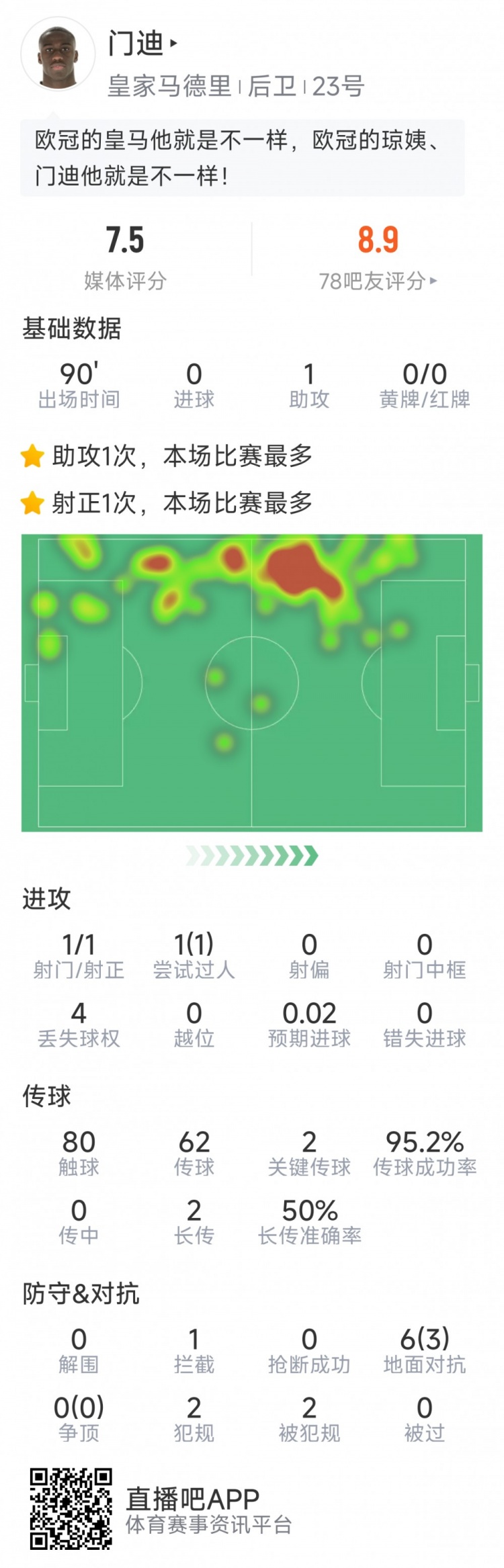 門迪本場數(shù)據(jù):1次助攻,1次射門,2次關(guān)鍵傳球,評分7.5分