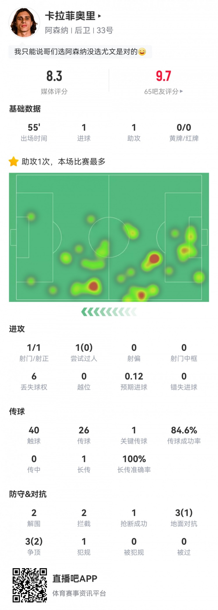 卡拉菲奧里數(shù)據(jù):替補(bǔ)55分鐘傳射建功,2次解圍2次攔截,評(píng)分8.3