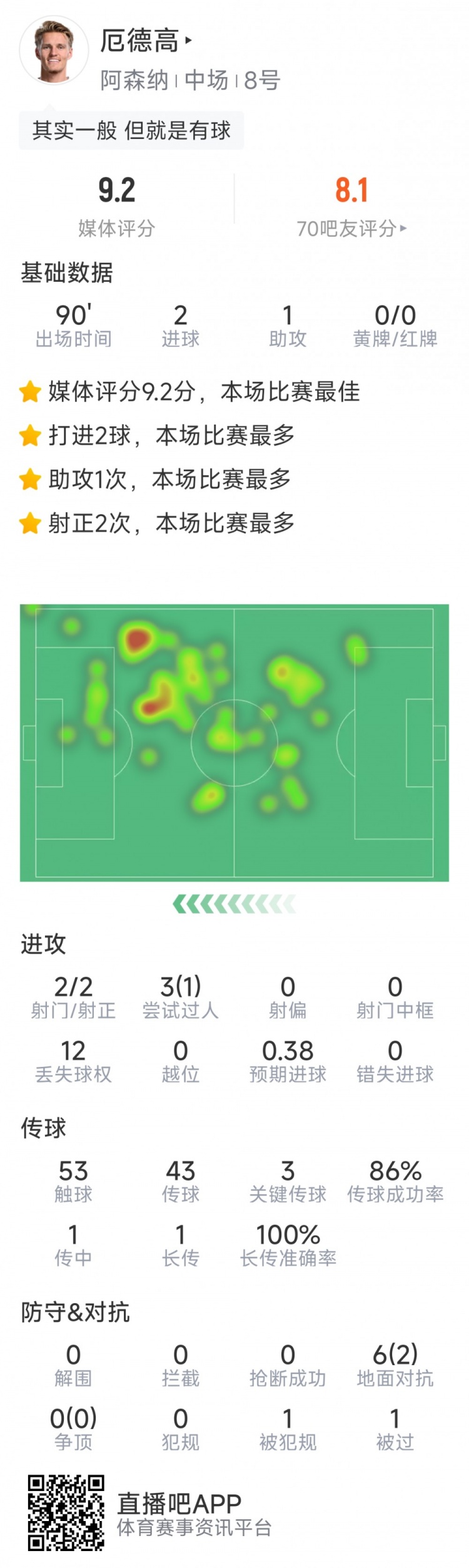3月5日訊 在本輪歐冠阿森納7-1擊敗埃因霍溫的比賽中,厄德高表現(xiàn)出色,以下為他在本場(chǎng)數(shù)據(jù):