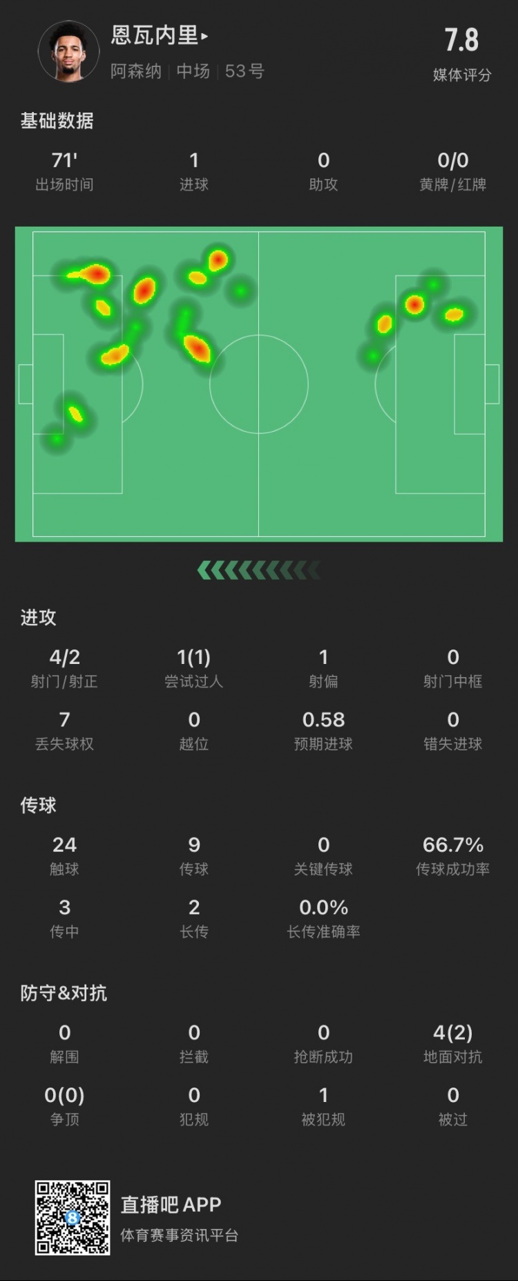 17歲恩瓦內(nèi)里本場(chǎng):4射2正進(jìn)1球,1次過人成功,4次對(duì)抗成功2次
