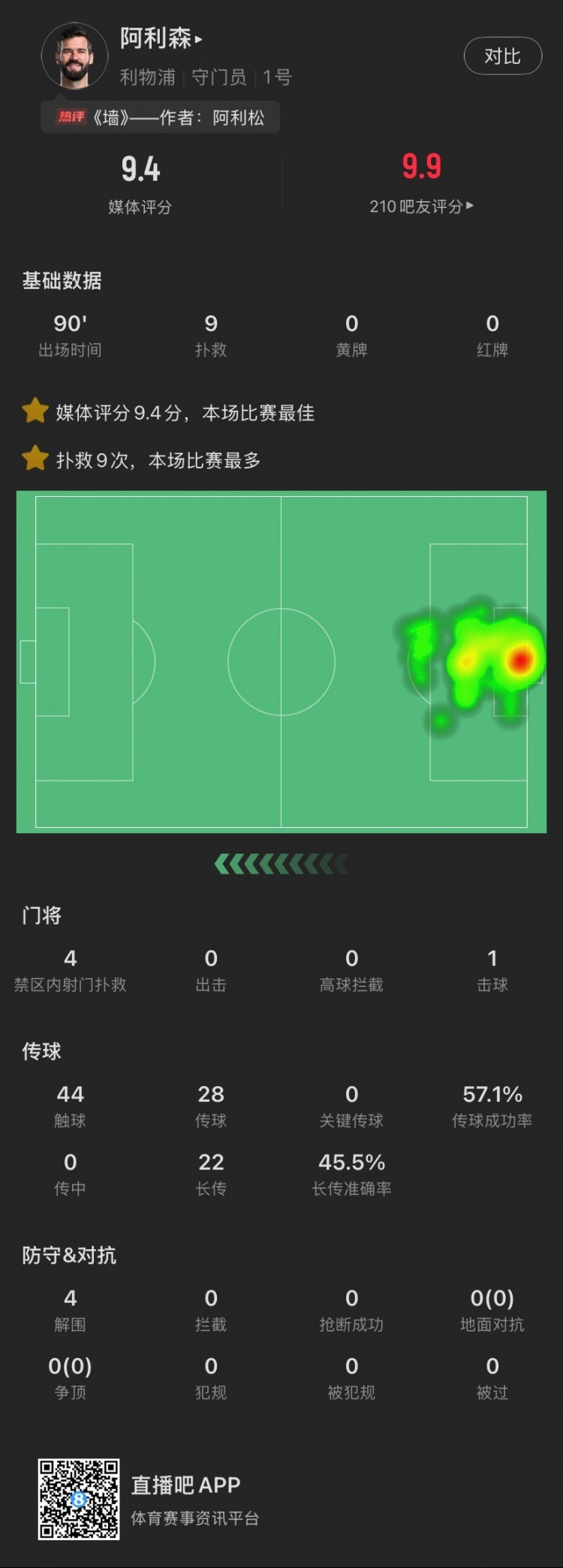 頭號功臣!阿利森本場:9次撲救,被射27腳0丟球,9.4分全場最高