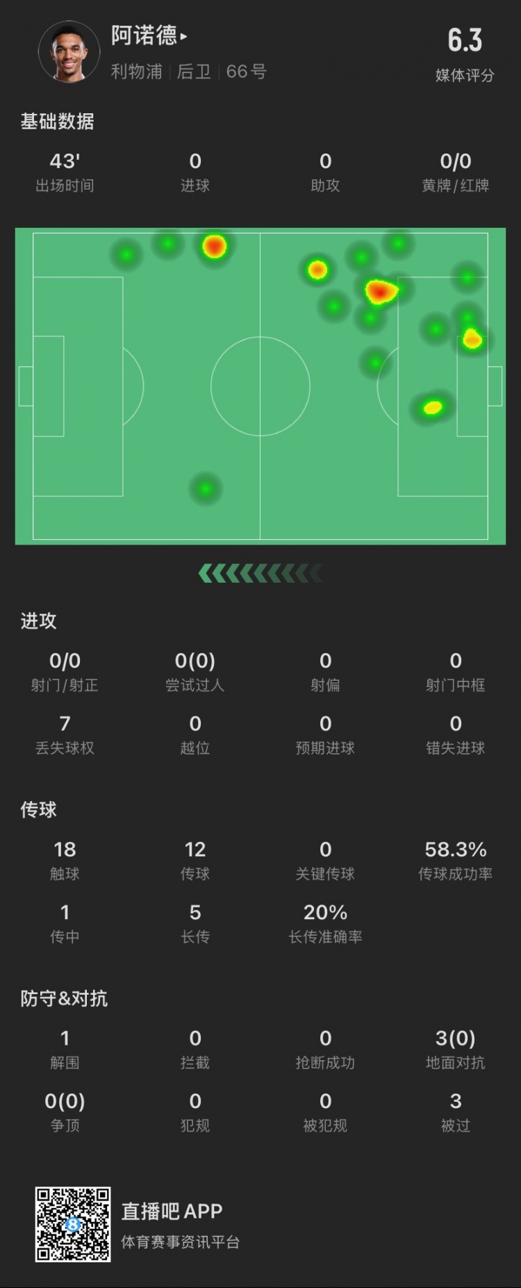 3月6日訊 歐冠1/8決賽首回合焦點戰(zhàn),巴黎主場對陣利物浦。半場戰(zhàn)罷,兩隊暫時0-0平。上半場,阿諾德多次被過,多項關鍵數(shù)據(jù)掛零,評分6.3全場第二低。