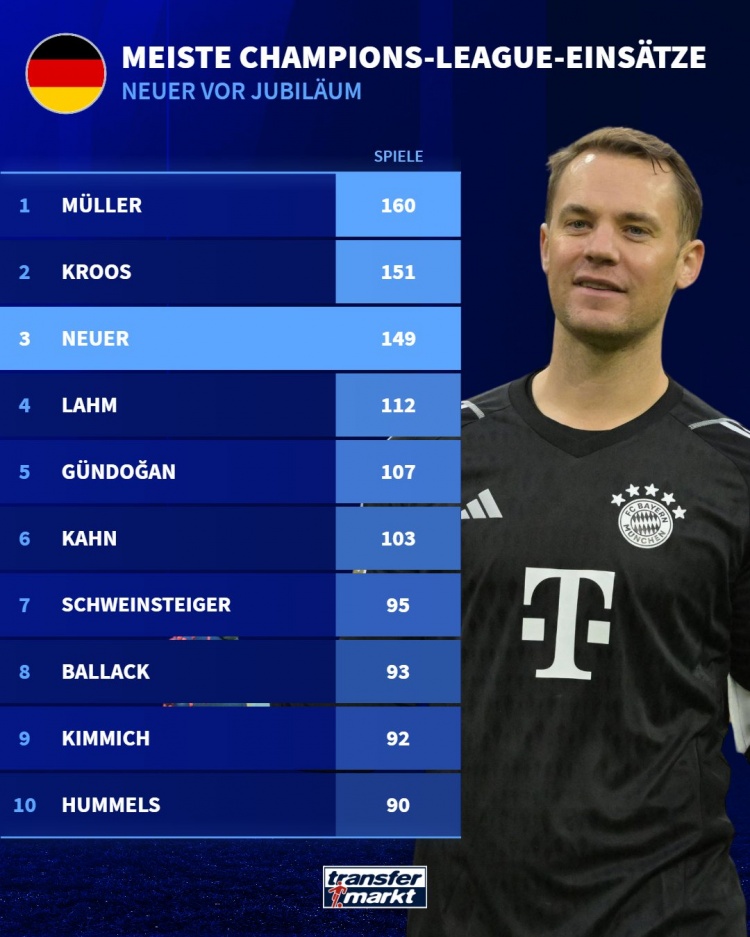 目前,諾伊爾是歐冠出場(chǎng)第三多的德國(guó)球員,也在歐冠歷史出場(chǎng)次數(shù)榜中排名第8。