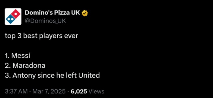 3月7日訊 歐聯(lián)杯1/8決賽首回合,貝蒂斯2-2戰(zhàn)平吉馬良斯。賽后,知名披薩連鎖品牌達(dá)美樂英國區(qū)官推盛贊安東尼。