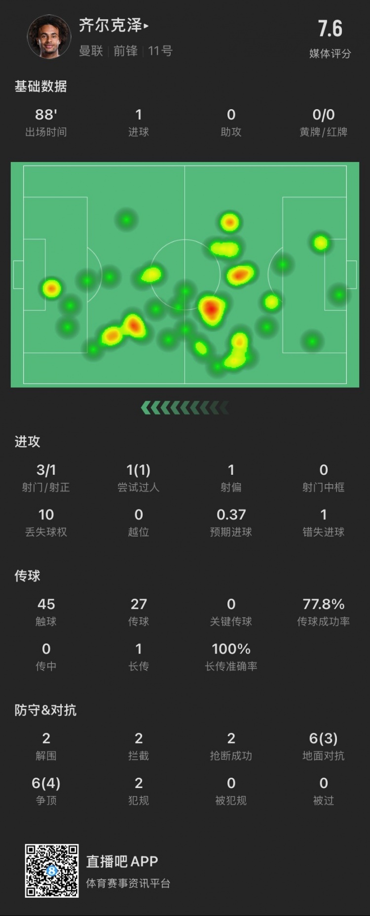 齊爾克澤本場:3射1正進1球,貢獻2解圍2搶斷,12次對抗成功7次