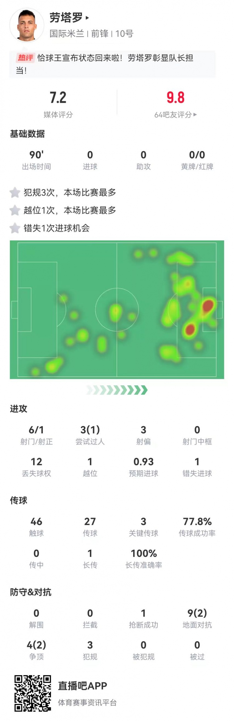 勞塔羅本場數(shù)據(jù):6射1正+1失良機(jī) 3關(guān)鍵傳球+3犯規(guī) 13對抗4成功