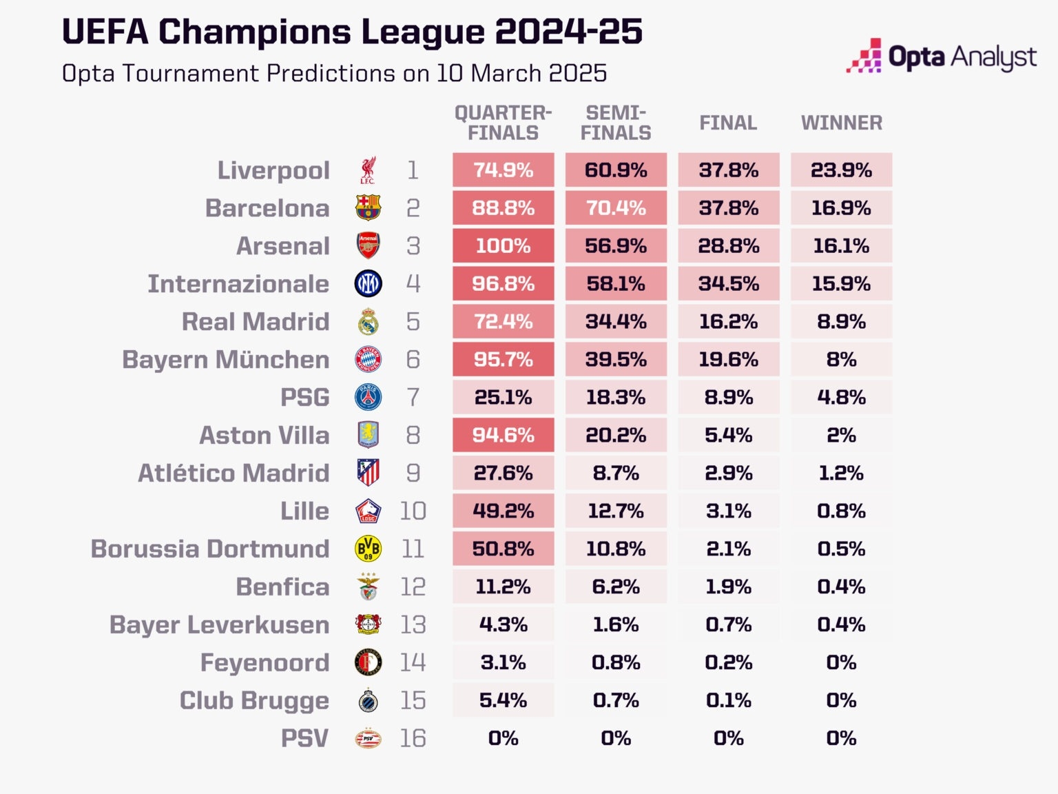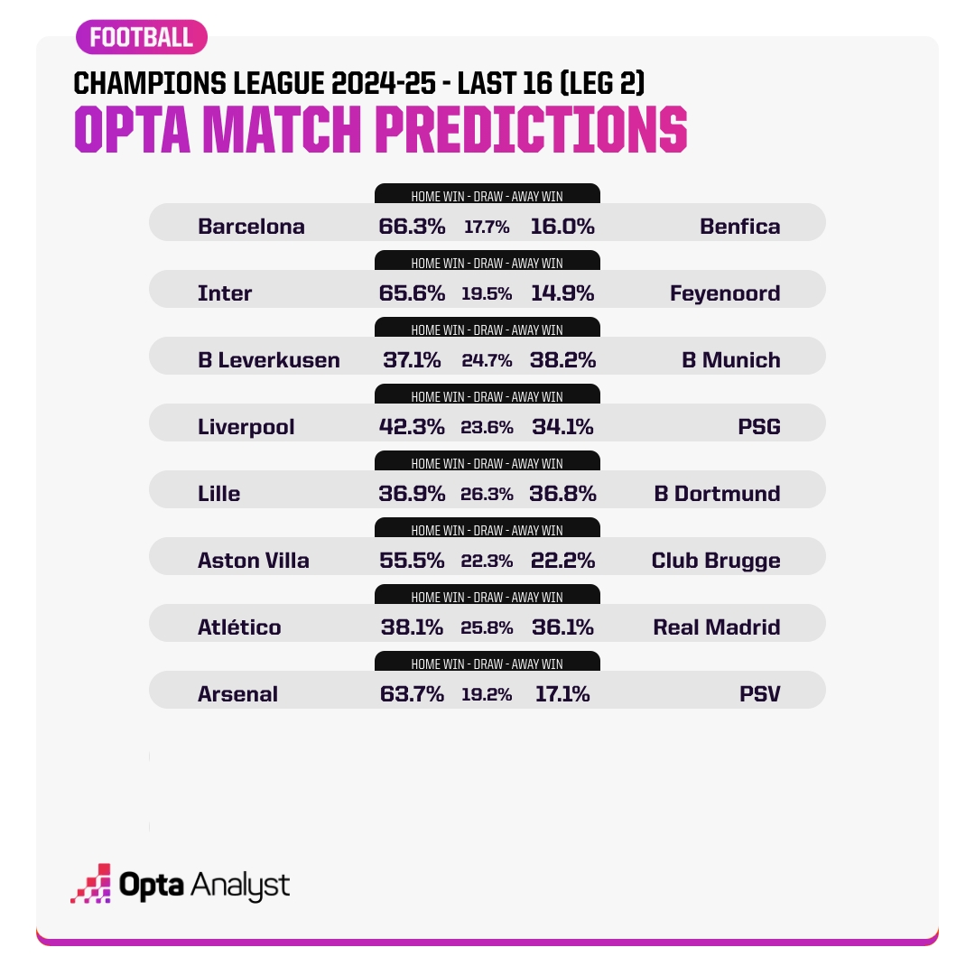 Opta預(yù)測歐冠1/8決賽次回合勝率: