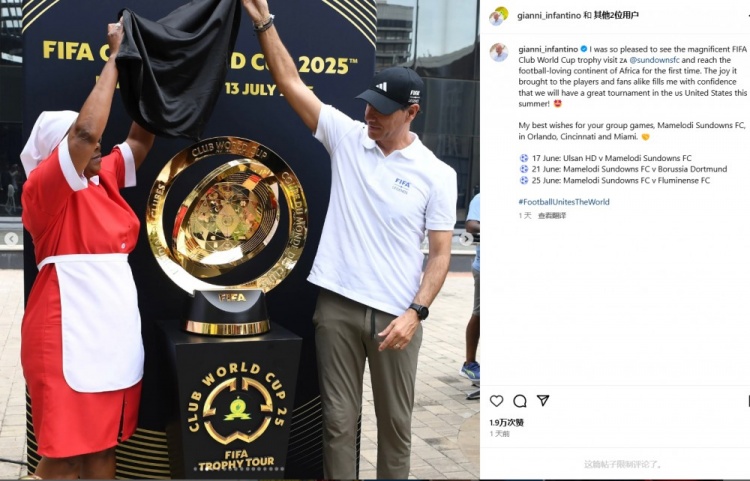 因凡蒂諾表示道:“我很高興看到這尊壯觀的世俱杯獎(jiǎng)杯造訪(fǎng)馬梅洛迪日落俱樂(lè)部,并首次抵達(dá)熱愛(ài)足球的非洲大陸。