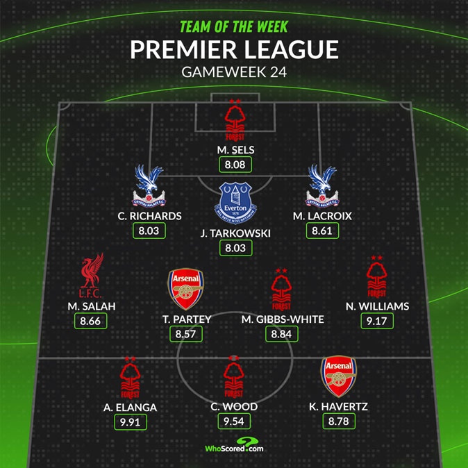 中場:薩拉赫(利物浦)、托馬斯(阿森納)、吉布斯-懷特(諾丁漢森林)、內(nèi)科-威廉姆斯(諾丁漢森林)