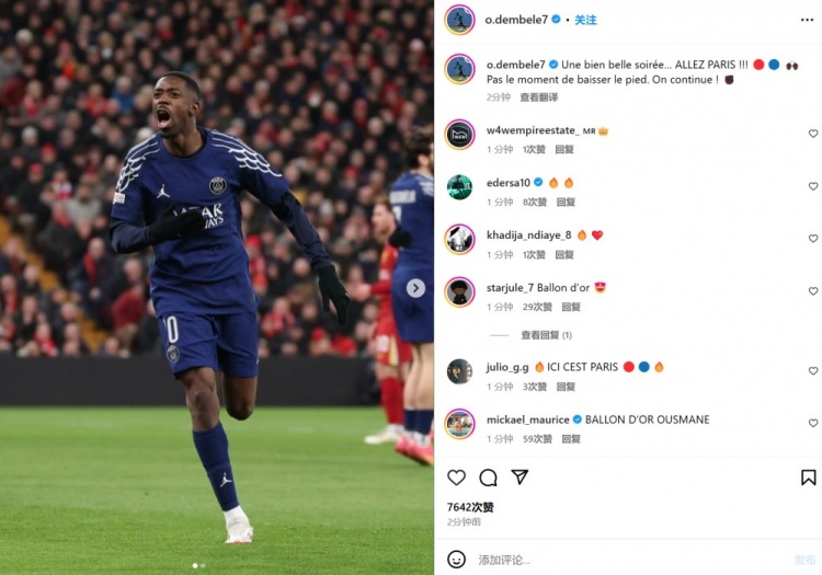 登貝萊也在賽后通過(guò)社媒曬出自己的慶祝照,并配文:“真是一個(gè)美好的夜晚……巴黎加油?。?!???????? ???????? 沒(méi)有時(shí)間放松。讓我們繼續(xù)前進(jìn)吧!”