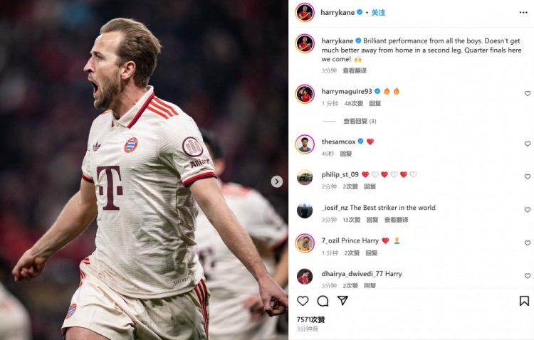 凱恩也在賽后通過社媒曬出自己的比賽照,并配文:“全隊交出精彩表現(xiàn),沒有比這更棒的客場次回合了。八強(qiáng)戰(zhàn)我們來了!”