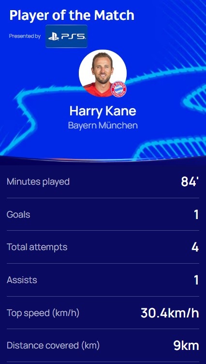 本場(chǎng)比賽凱恩發(fā)揮出色,打進(jìn)一球還有1次助攻,4次射門,跑動(dòng)距離也達(dá)到9km,賽后凱恩當(dāng)選歐冠官方評(píng)選出的本場(chǎng)最佳球員。