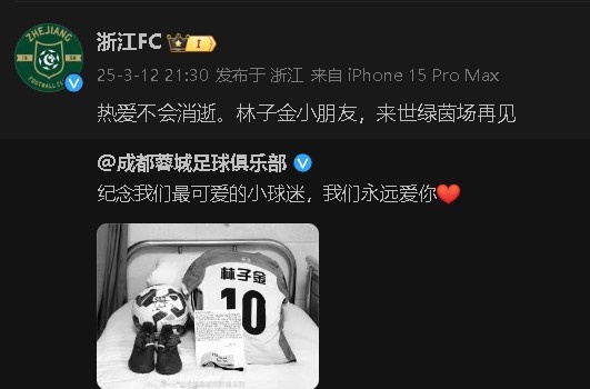 3月12日訊 成都蓉城官方發(fā)布訃告,身患重癥的成都蓉城小球迷林子金不幸去世。浙江隊社媒發(fā)文悼念:熱愛不會消逝。林子金小朋友,來世綠茵場再見。 標簽: 足球 中超 中國足球 成都蓉城 浙江