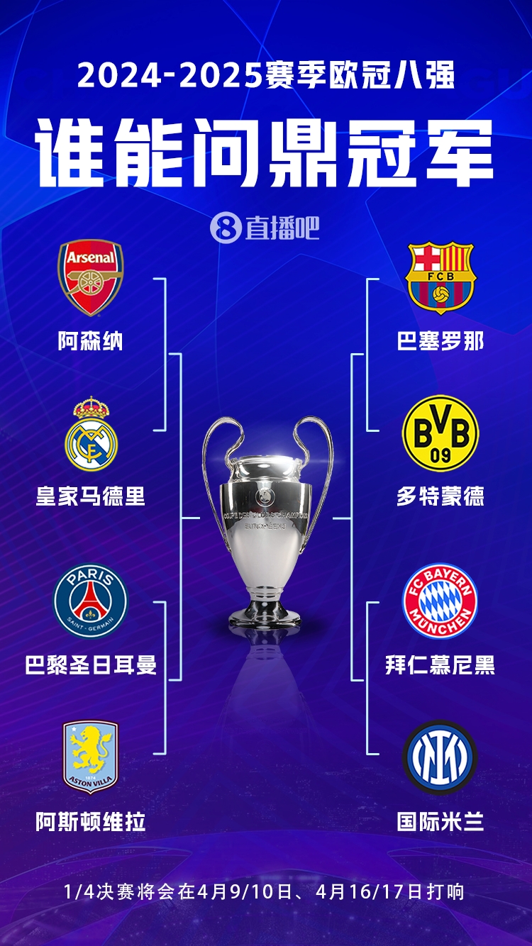豪門之戰(zhàn)!歐冠8強全員五大聯(lián)賽,6隊拿過冠軍&槍手巴黎拿過亞軍