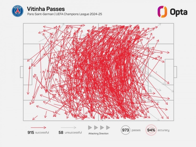 維蒂尼亞單賽季歐冠成功傳球已915次,近21年中場僅哈維等4人做到