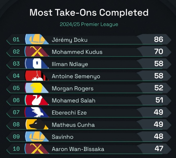 本賽季英超成功過(guò)人榜: