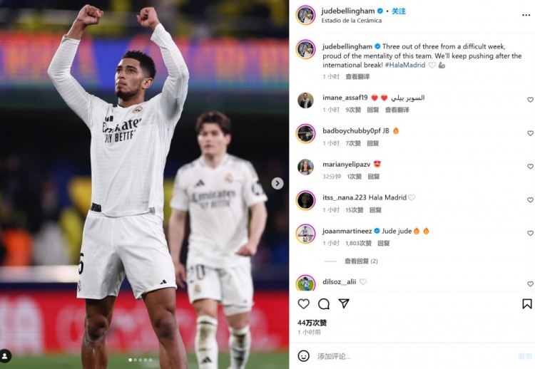 3天內踢滿210分鐘!貝林社媒:一周3戰(zhàn),為球隊的意志力感到驕傲