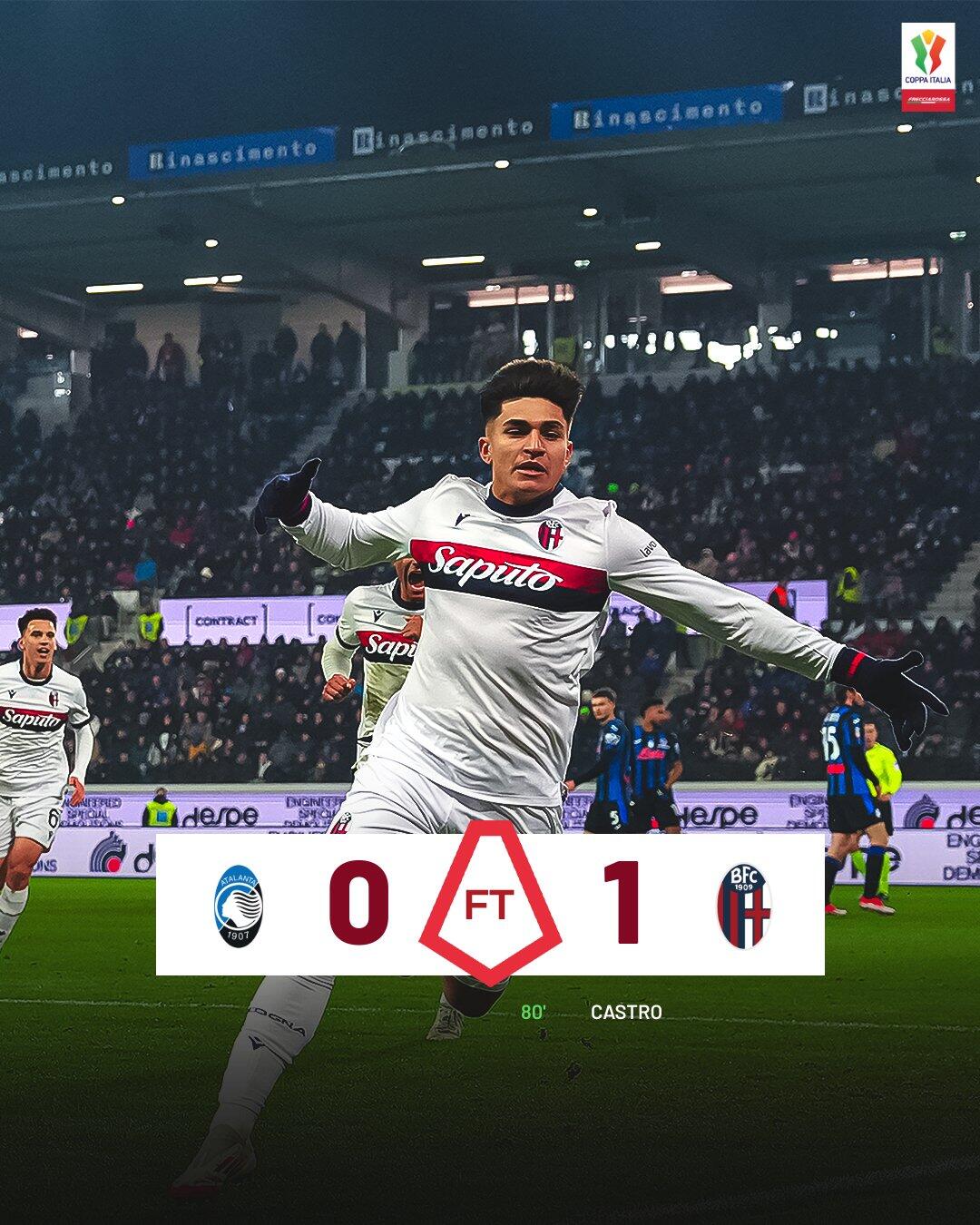 意大利杯1/4決賽,博洛尼亞1-0擊敗亞特蘭大晉級四強。上半場,雙方均無建樹;下半場,直到第80分鐘,替補登場的卡斯特羅一擊制勝。