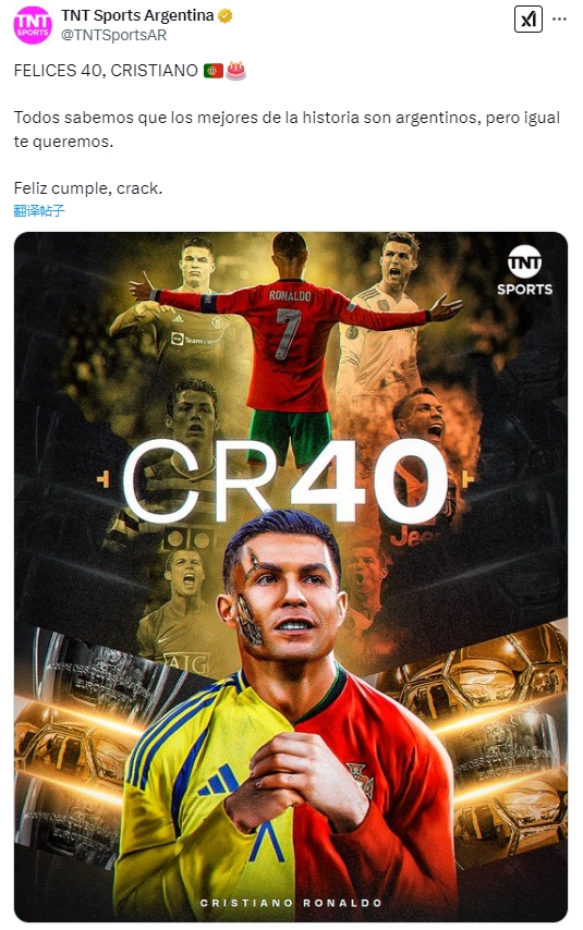 02月05日訊 今天是C羅的40歲生日,TNT體育阿根廷頻道發(fā)文為C羅慶生。
