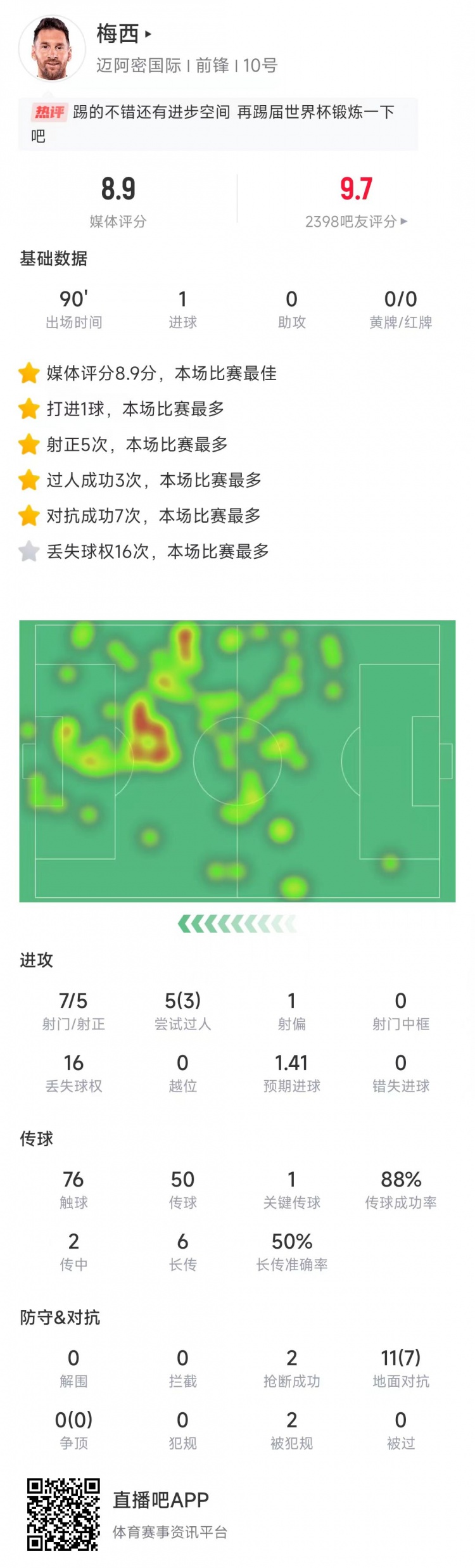 挑射破門!梅西本場數(shù)據(jù):7次射門5次射正,獲評(píng)8.9分全場最高