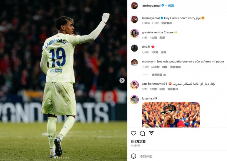 數(shù)據(jù)統(tǒng)計(jì)顯示,亞馬爾也就此結(jié)束了長達(dá)4個(gè)半月的西甲進(jìn)球荒,他本人也通過社媒曬照慶祝:“嘿,巴薩球迷們,別擔(dān)心,哈哈????”。