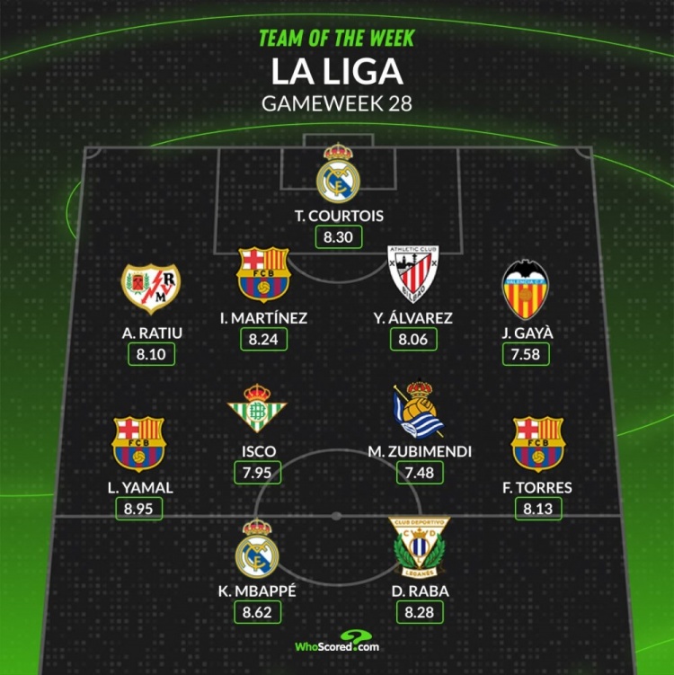 whoscored本周西甲最佳陣:姆巴佩、亞馬爾領(lǐng)銜,費(fèi)蘭、褲襪在列