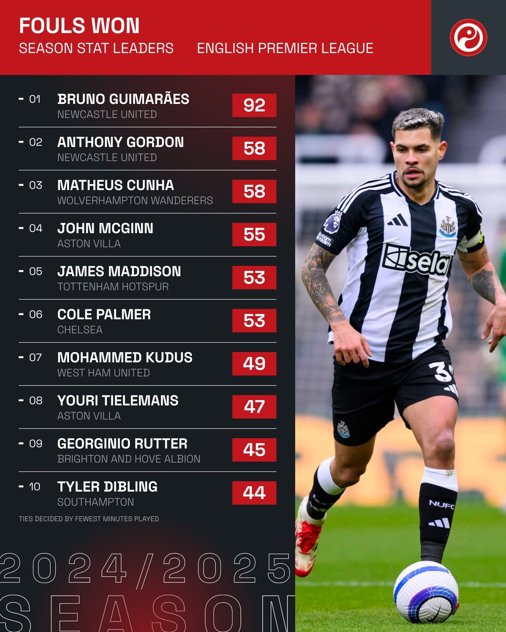 03月18日訊 squakwa統(tǒng)計了本賽季英超球員被犯規(guī)次數(shù)榜,吉馬良斯高居榜首,麥迪遜、帕爾默在列。