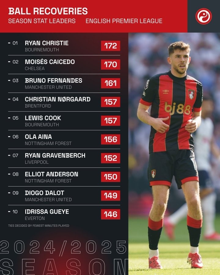 本賽季英超贏得球權(quán)榜:凱塞多170次第二,B費(fèi)、赫拉芬貝赫在列