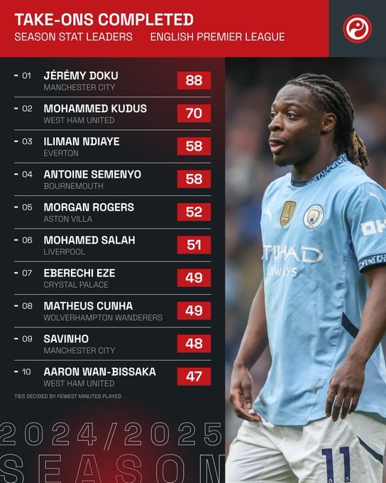 3月18日訊 曼城在本輪英超2-2戰(zhàn)平布萊頓,多庫單場13次成功過人。squakwa也統(tǒng)計了本賽季英超成功過人榜,多庫獨(dú)自領(lǐng)跑。