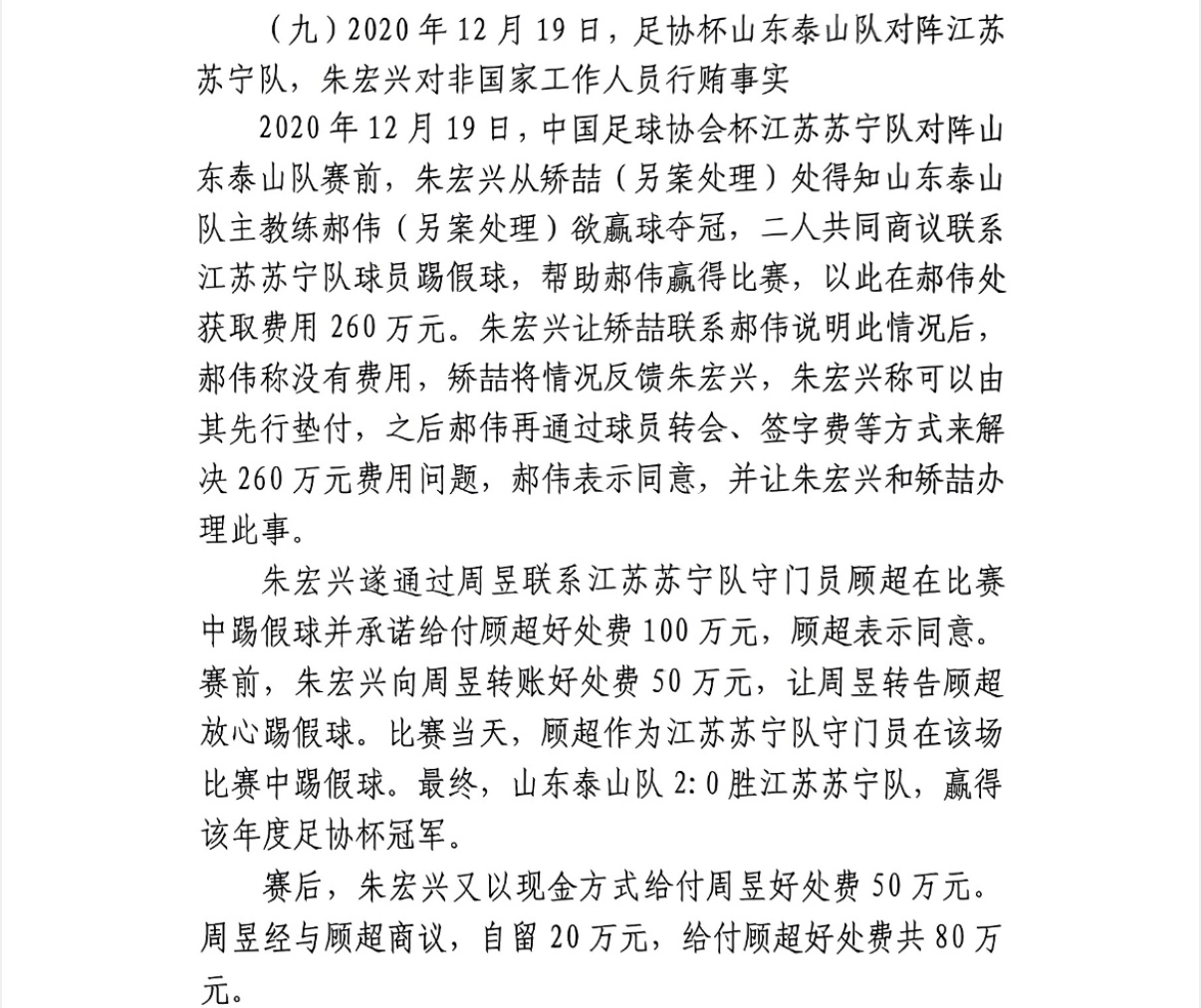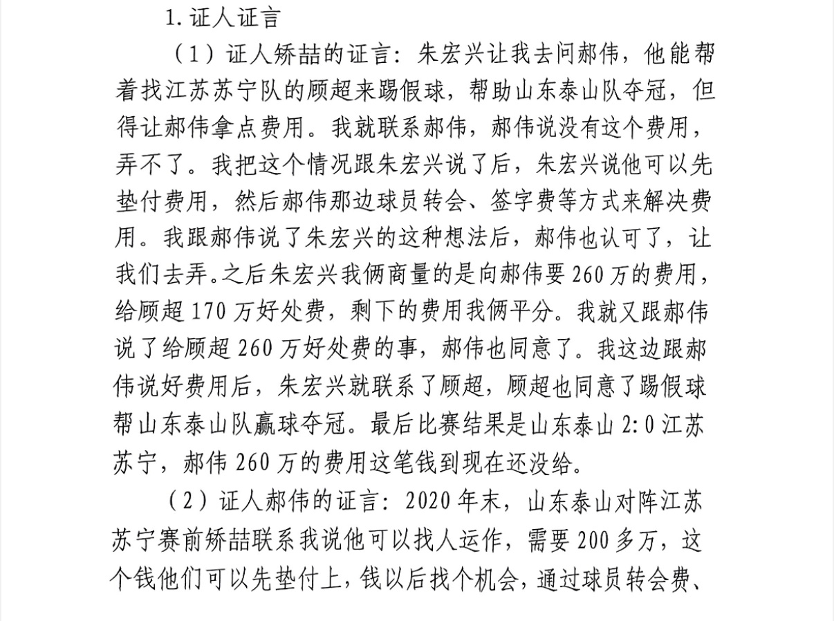 矯喆的證言:朱宏興讓我去問(wèn)郝偉,他能幫著找江蘇蘇寧隊(duì)的顧超來(lái)踢假球,幫助山東泰山隊(duì)奪冠,但得讓郝偉拿點(diǎn)費(fèi)用。我就聯(lián)系郝偉,郝偉說(shuō)沒(méi)有這個(gè)費(fèi)用,弄不了。我把這個(gè)情況跟朱宏興說(shuō)了后,朱宏興說(shuō)他可以先墊付費(fèi)用,然后郝偉那邊球員轉(zhuǎn)會(huì)、簽字費(fèi)等方式來(lái)解決費(fèi)用。我跟郝偉說(shuō)了朱宏興的這種想法后,郝偉也認(rèn)可了,讓我們?nèi)ヅ?。之后朱宏興我倆商量的是向郝偉要260萬(wàn)的費(fèi)用,給顧超170萬(wàn)好處費(fèi),剩下的費(fèi)用我倆平分。我就又跟郝偉說(shuō)了給顧超260萬(wàn)好處費(fèi)的事,郝偉也同意了。我這邊跟郝偉說(shuō)好費(fèi)用后,朱宏興就聯(lián)系了顧超,顧超也同意了踢假球幫山東泰山隊(duì)贏球奪冠。最后比賽結(jié)果是山東泰山2:0江蘇蘇寧,郝偉260萬(wàn)的費(fèi)用這筆錢(qián)到現(xiàn)在還沒(méi)給。