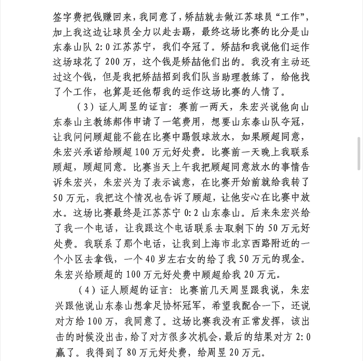 周昱的證言:賽前一兩天,朱宏興說(shuō)他向山東泰山主教練郝偉申請(qǐng)了一筆費(fèi)用,想要山東泰山隊(duì)奪冠,讓我問(wèn)問(wèn)顧超能不能在比賽中踢假球放水,如果顧超同意,朱宏興承諾給顧超100萬(wàn)元好處費(fèi)。比賽前一天晚上我聯(lián)系顧超,顧超同意。比賽當(dāng)天上午我把顧超同意放水的事情告訴朱宏興,朱宏興為了表示誠(chéng)意,在比賽開(kāi)始前就給我轉(zhuǎn)了50萬(wàn)元,我把這個(gè)情況也告訴了顧超,讓他安心在比賽中放水。這場(chǎng)比賽最終是江蘇蘇寧0:2山東泰山。后來(lái)朱宏興給了我一個(gè)電話,讓我跟這個(gè)電話聯(lián)系去取剩下的50萬(wàn)元好處費(fèi)。我聯(lián)系了那個(gè)電話,讓我到上海市北京西路附近的一個(gè)小區(qū)去拿錢(qián),一個(gè)40歲左右女的給了我50萬(wàn)元的現(xiàn)金。朱宏興給顧超的100萬(wàn)元好處費(fèi)中顧超給我20萬(wàn)元。