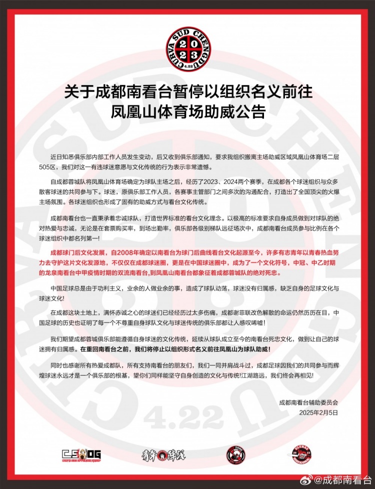 關(guān)于成都南看臺暫停以組織名義前往鳳凰山體育場助威公告