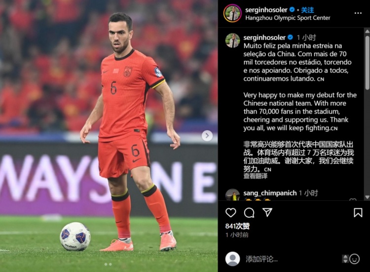 塞爾吉尼奧更新個(gè)人社媒,曬出個(gè)人賽場照,并用中英葡三種語言寫道:非常高興能夠首次代表中國國家隊(duì)出戰(zhàn)。體育場內(nèi)有超過 7 萬名球迷為我們加油助威。謝謝大家,我們會(huì)繼續(xù)努力。