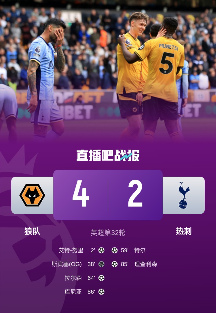 熱刺2-4不敵狼隊(duì),近6輪4負(fù)的同時(shí),送給狼隊(duì)英超4連勝。