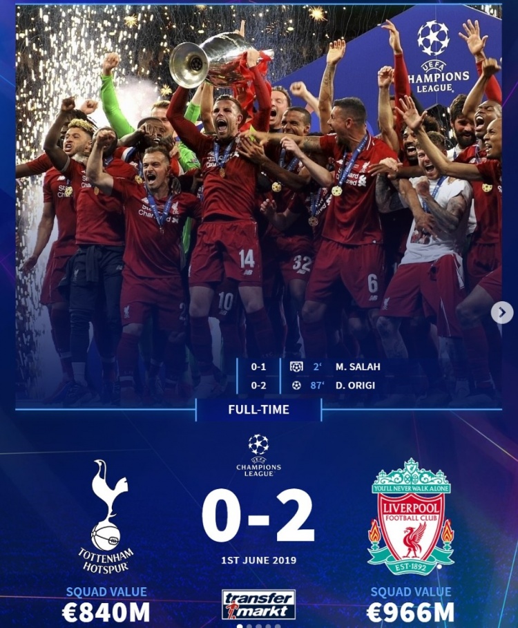 2019年6月,歐冠決賽:熱刺0-2利物浦,此前長(zhǎng)期受傷的凱恩火線復(fù)出表現(xiàn)不佳,薩拉赫開(kāi)場(chǎng)閃擊、奧里吉鎖定勝局。