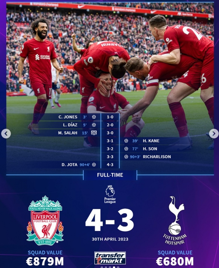 2023年4月,英超:利物浦4-3熱刺。瓊斯、路易斯-迪亞斯、薩拉赫上半場(chǎng)連入三球,凱恩、孫興慜連扳兩球,理查利森第93分鐘“絕平”,若塔第94分鐘絕殺。