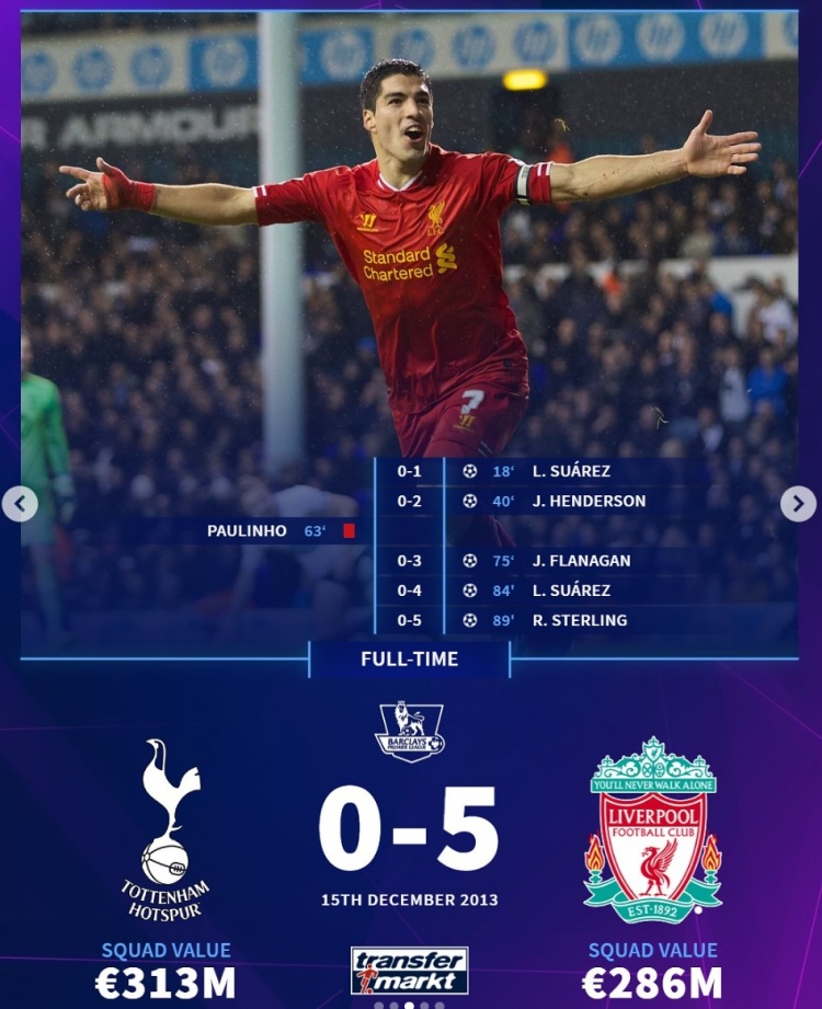 2013年12月,英超:熱刺0-5利物浦。蘇亞雷斯貢獻(xiàn)2球2助攻,并制造保利尼奧染紅,亨德森傳射建功,紅軍客場(chǎng)取得大勝。