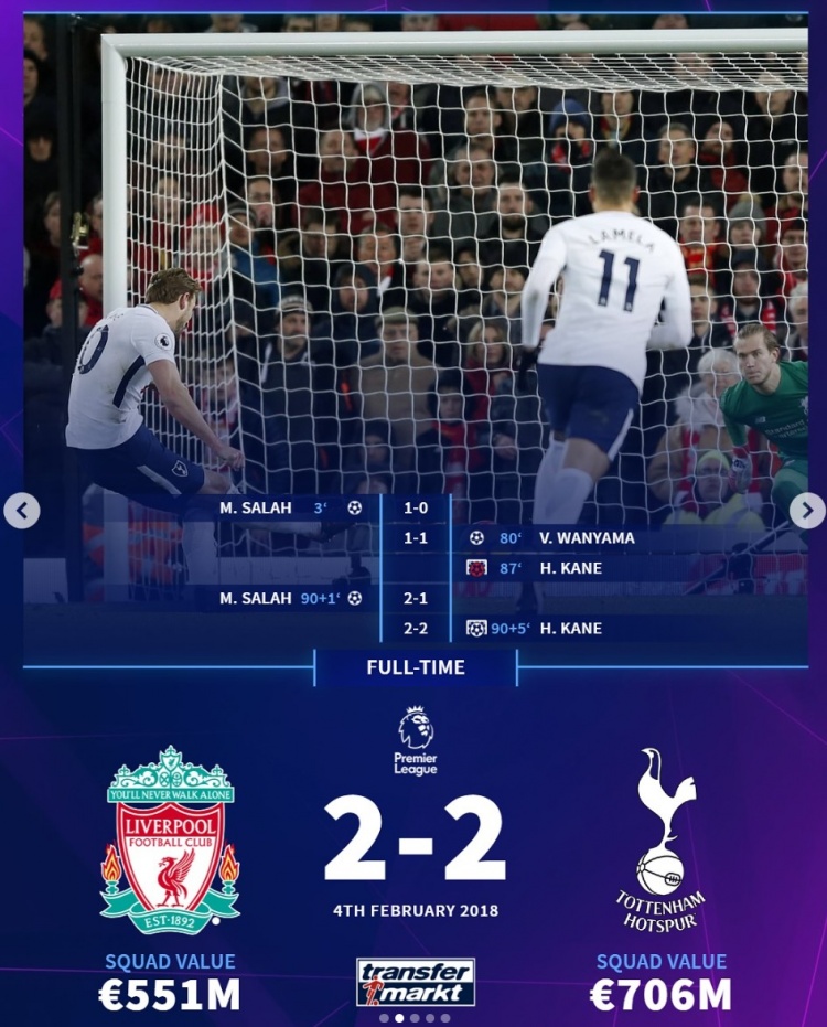 2018年2月,英超:利物浦主場(chǎng)2-2熱刺。薩拉赫開(kāi)場(chǎng)閃擊,萬(wàn)亞馬替補(bǔ)世界波扳平,凱恩第87分鐘失點(diǎn),薩拉赫第91分鐘“絕殺”,凱恩第95分鐘再次主罰點(diǎn)球完成絕平。