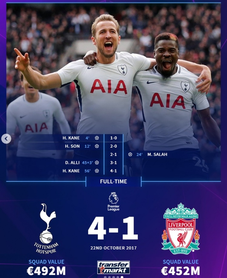 2017年10月,英超:熱刺主場(chǎng)4-1利物浦。孫凱上半場(chǎng)各進(jìn)一球,薩拉赫扳回一城,阿里上半場(chǎng)補(bǔ)時(shí)破門(mén),凱恩下半場(chǎng)再進(jìn)一球鎖定勝局。