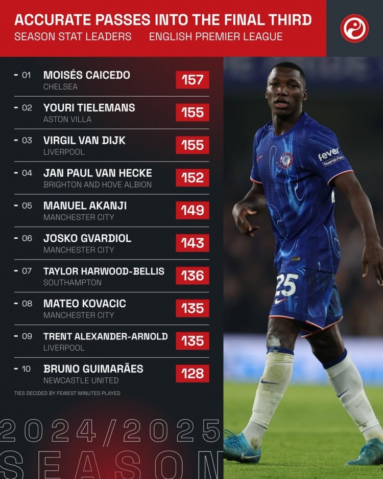 英超傳球到進(jìn)攻三區(qū)榜:凱塞多壓范迪克居首,曼城3將在列