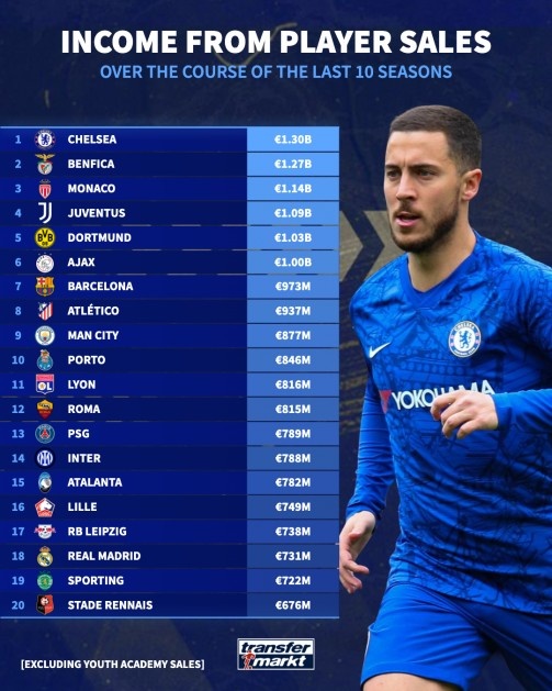 2月9日訊 德國(guó)轉(zhuǎn)會(huì)市場(chǎng)統(tǒng)計(jì)了近10個(gè)賽季各俱樂部出售球員所得收入的排名,切爾西通過賣球員賺到13億歐元轉(zhuǎn)會(huì)費(fèi),排名第一。
