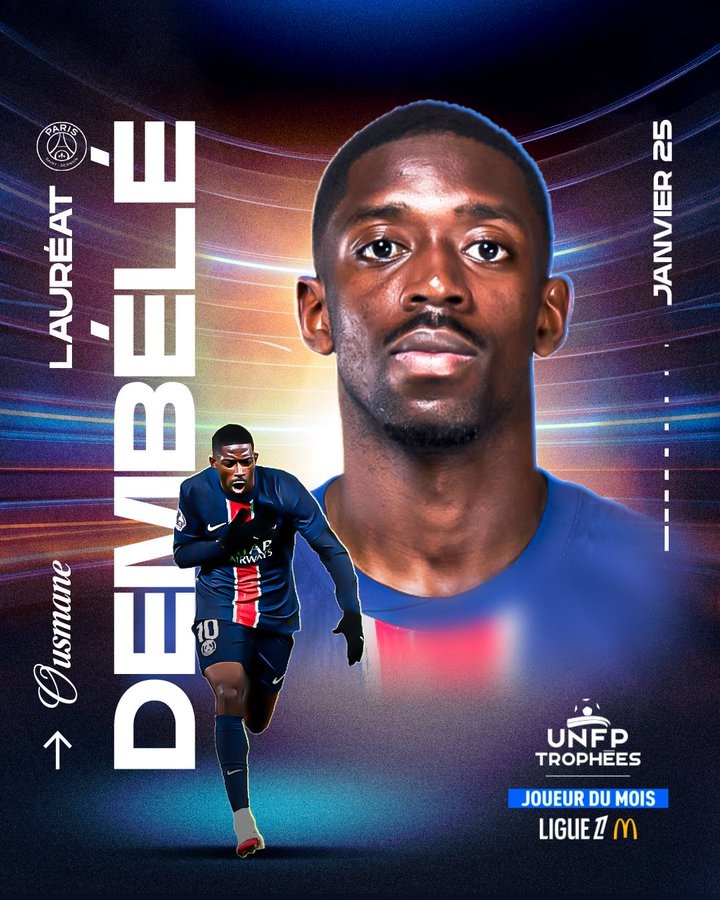 2月9日訊 官方消息,巴黎圣日耳曼邊鋒登貝萊當(dāng)選法甲1月最佳球員。