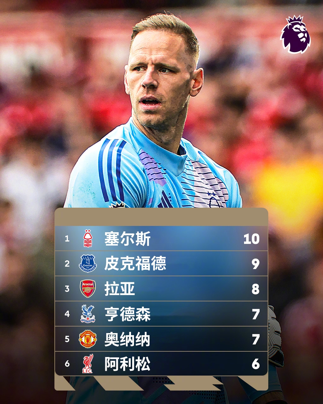 誰(shuí)能想到?英超金手套獎(jiǎng)爭(zhēng)奪形勢(shì):森林門(mén)將塞爾斯10次零封領(lǐng)跑