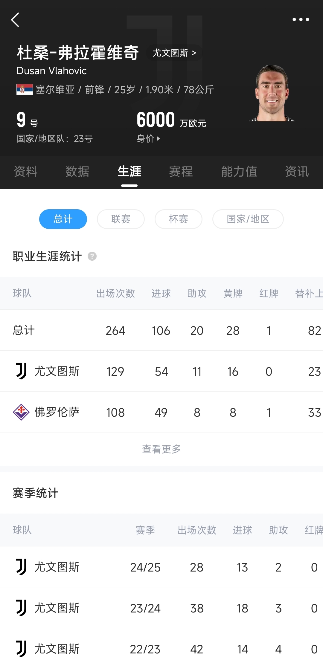 2022年冬窗,尤文以8350萬歐元的轉(zhuǎn)會費從佛羅倫薩簽下弗拉霍維奇,迄今弗拉霍維奇代表尤文出戰(zhàn)129場比賽,貢獻54球11助。目前弗拉霍維奇在尤文的稅后年薪為1200萬歐元,高居隊內(nèi)薪資榜首(第二的布雷默500萬歐元)。