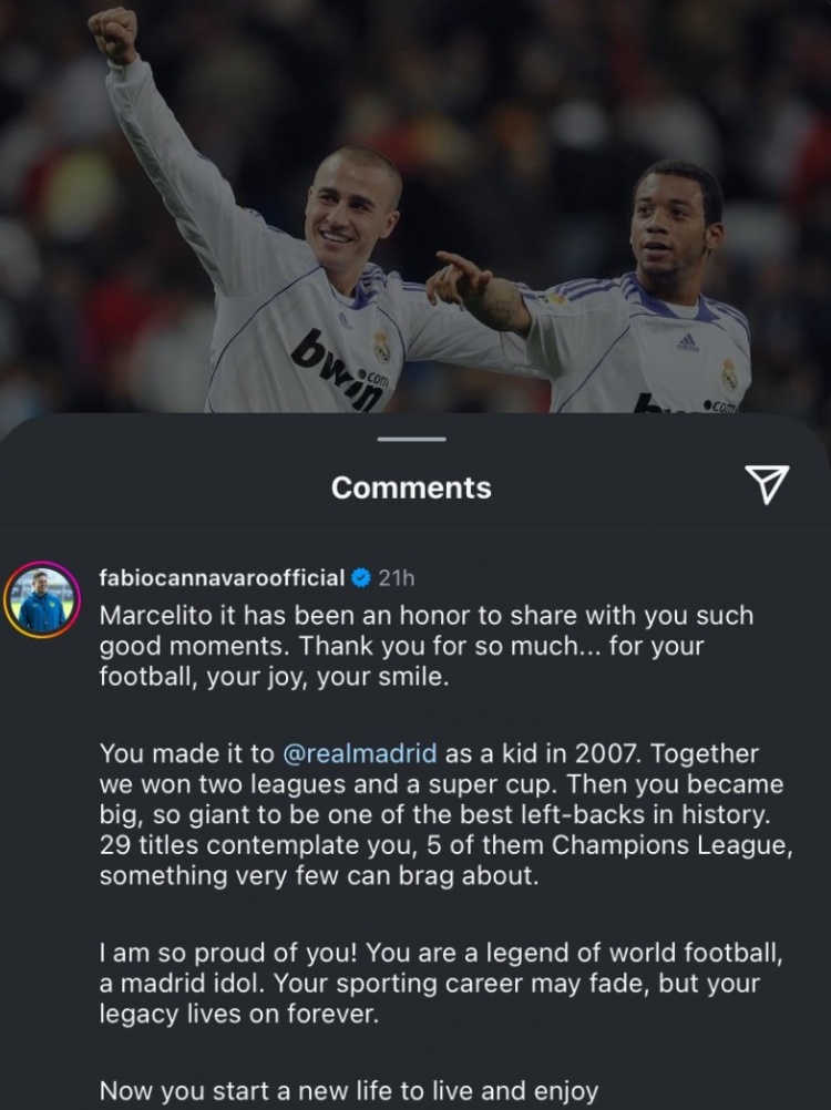 卡納瓦羅表示:“小馬塞洛,能榮幸能夠和你共享一段美好時(shí)光。非常感謝你的足球技術(shù)以及你的快樂感染力。你在2007年加盟皇馬時(shí)還是一個(gè)孩子,我們共同贏得了2座西甲和一座西超杯。而自那之后,你成長(zhǎng)為了足壇歷史最佳左后衛(wèi)之一。”
