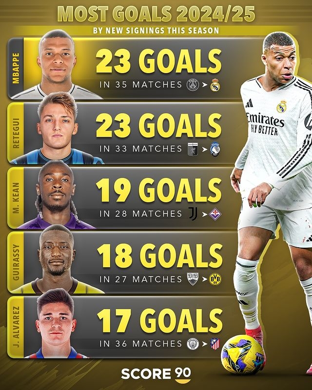 1、姆巴佩(巴黎→皇馬):35場(chǎng)27球